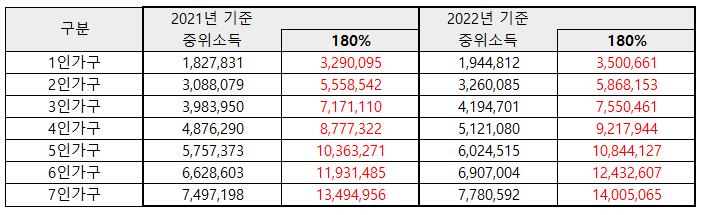 * 8인 이상 가구의 기준 중위소득은 1인 증가시마다 ‘21년은 868,595원, ’ 22년은 873,588원씩 증가